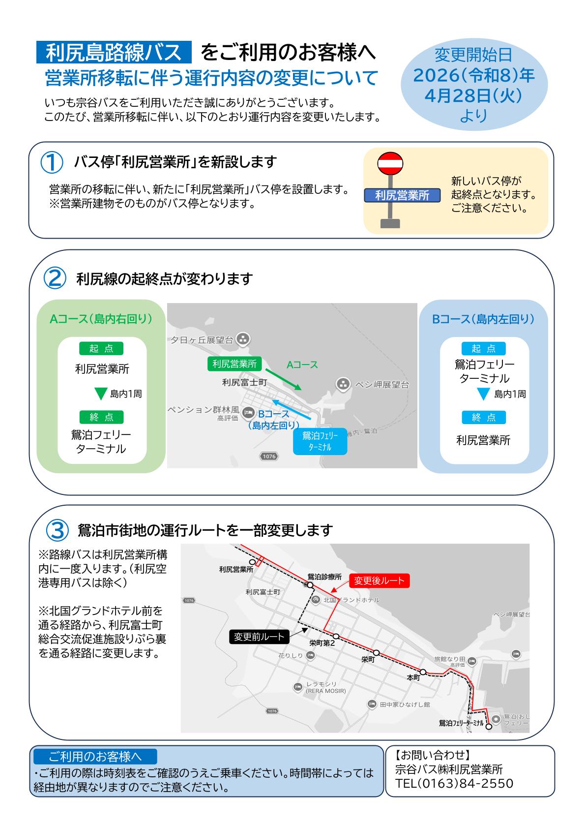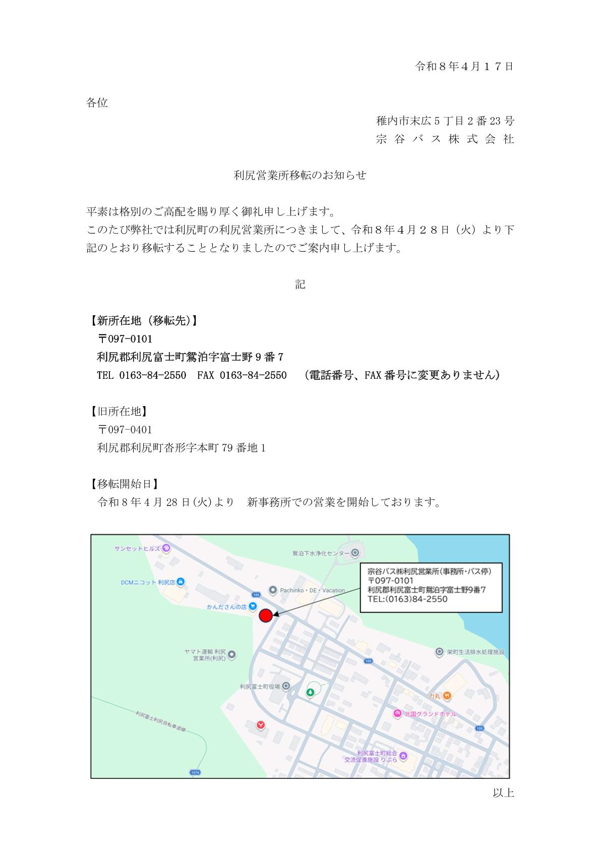 いつも宗谷バスをご利用いただき誠にありがとうございます。 令和8年4月28日(火)より、利尻営業所を移転いたします。